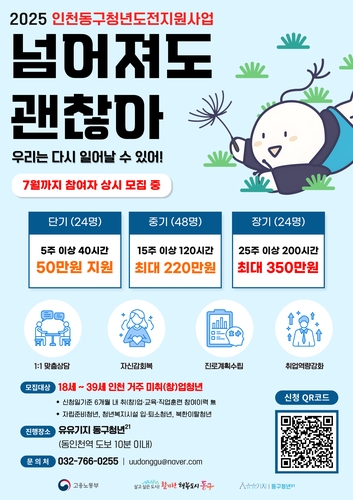 참여 희망자는 고용24 누리집 또는 유유기지 동구청년21 누리집을 통해 신청할 수 있다. 참여자 모집 기간은 오는 7월까지로 자세한 문의는 동구 청년도전지원사업팀(032-766-0255)으로 하면 된다.
